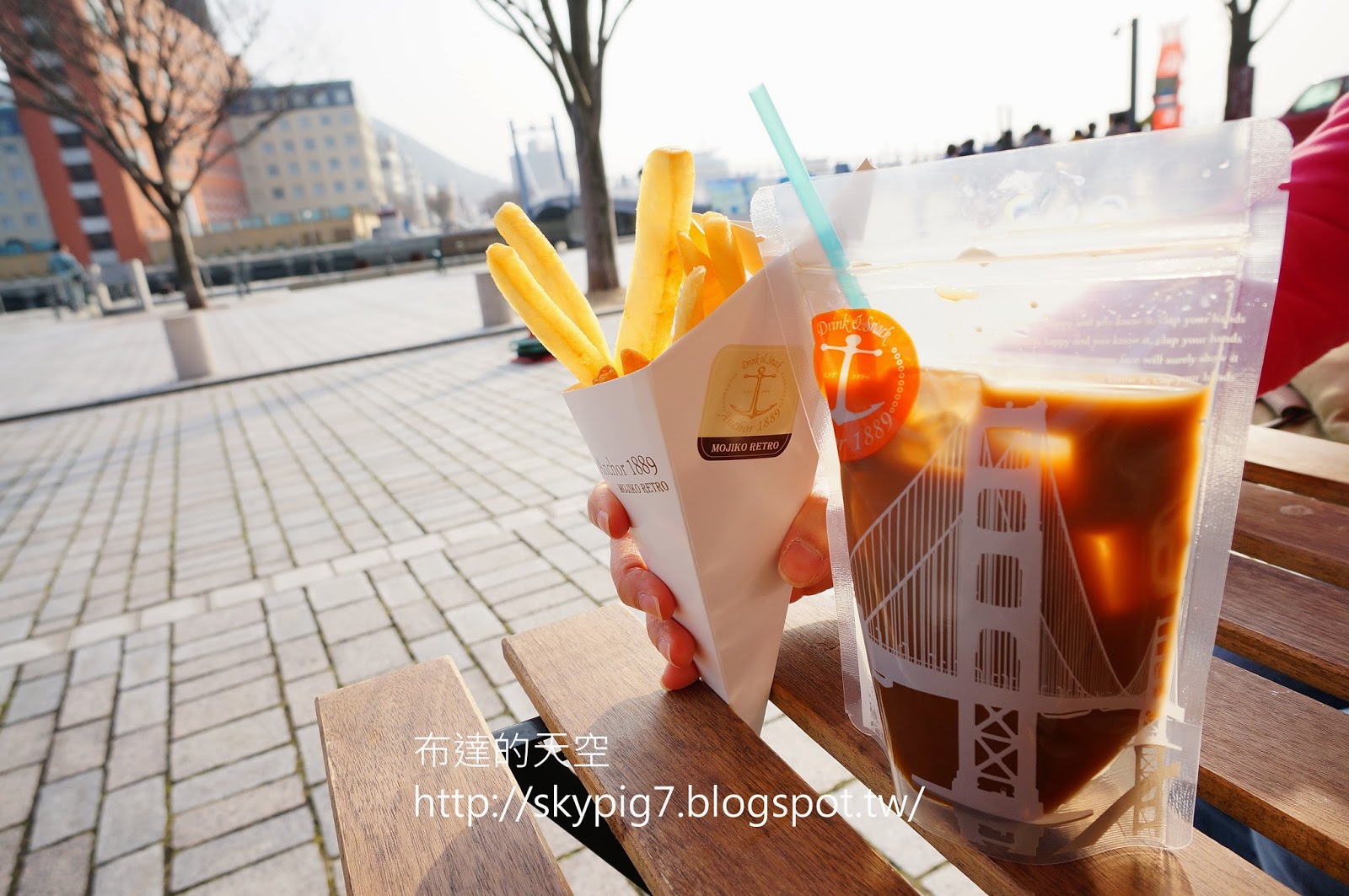 在橋旁邊有家店門口擺設大型薯條,可以叫份薯條跟奶茶在旁邊休息一下