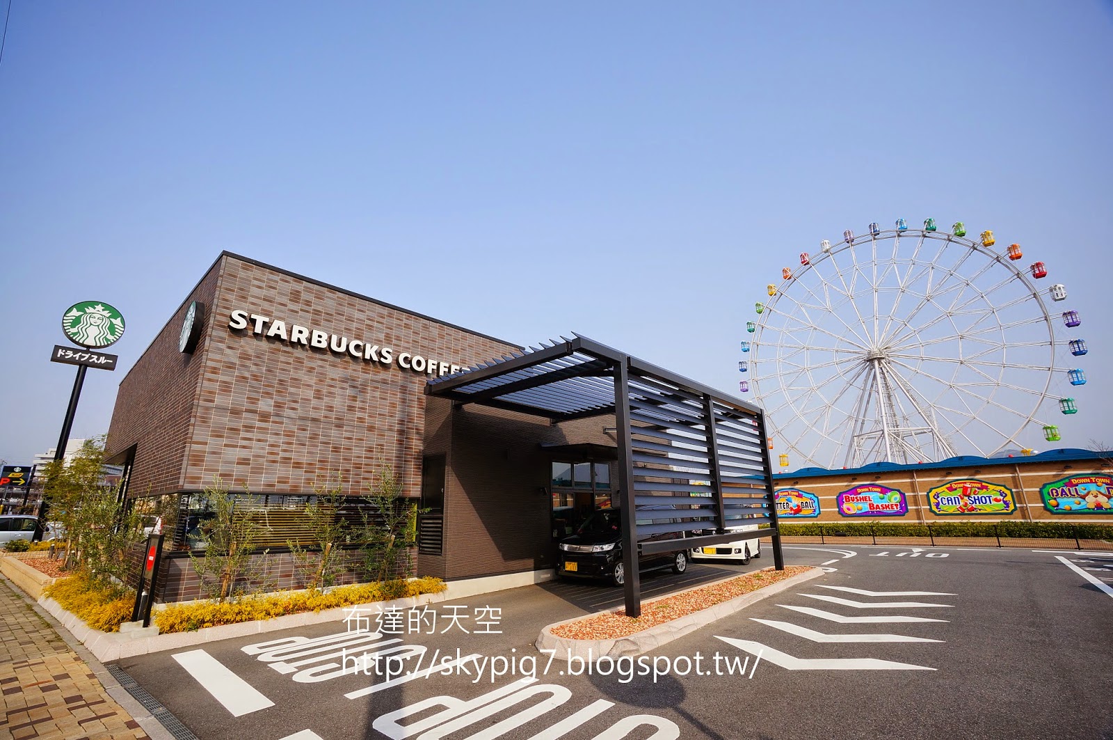 唐戶市場用完餐後,先不用急著坐船,再繼續往前(西南方)走,可到「市立しものせき水族館海響館」,在旁邊有STARBUCKS跟摩天輪可以逛逛,摩天輪加上雙層巴士是不是有種身處英倫的感覺呢?
