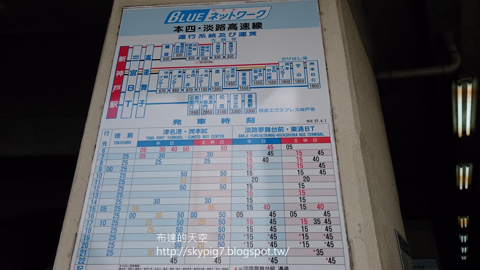 從班次表可看到是從新神戶發車(高速バス班次表),沿途會經過三宮BT、高速舞子,然後看你要到淡路夢舞台或津名港,本次是要到淡路夢舞台(930円),平均一個小時一班,我到的時候車剛走,所以決定去舞子站坐車