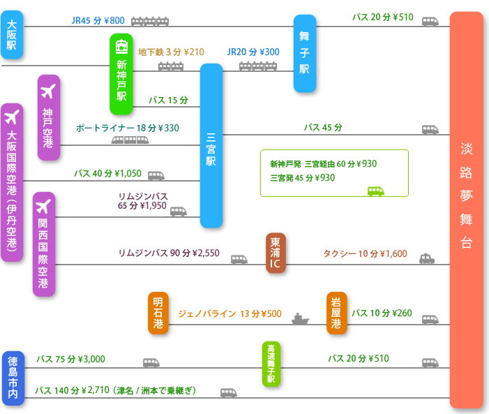 ②新神戶 ➔(地鐵)➔三ノ宮➔(JR)➔舞子➔バス➔淡路夢舞台前