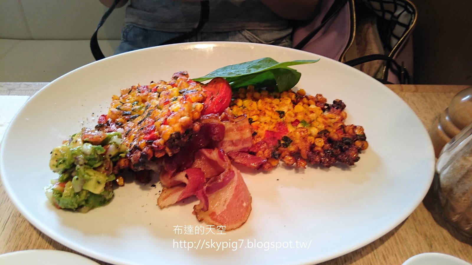 接下來是家裏煮飯點的corn fritters,就是玉米XX,不知道如何翻,裏面有玉米、培根、酪梨、蕃茄、生菠菜調製而成