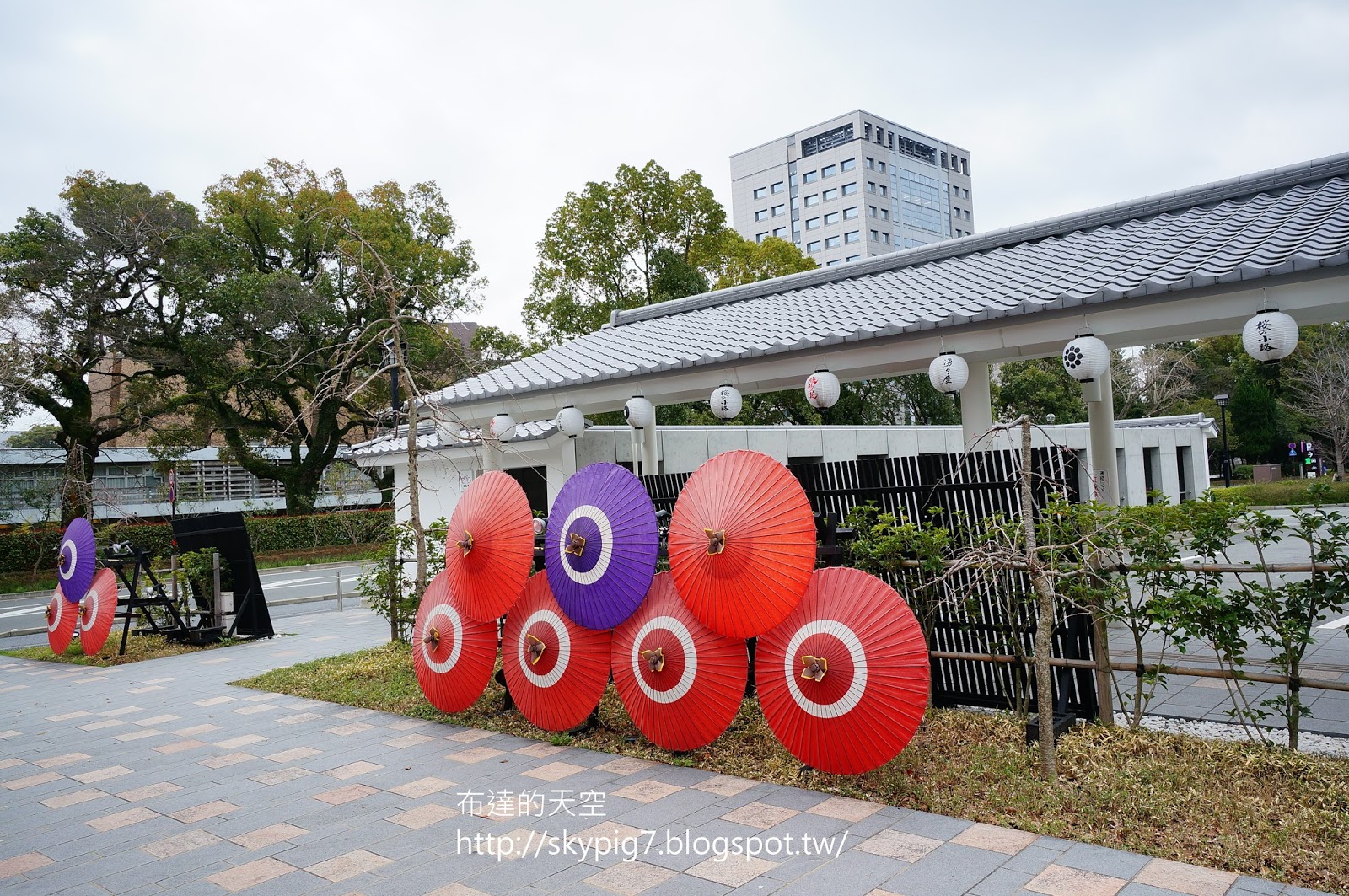 以上面的地圖來講,從行幸橋走過來,主要分成兩個部分,右手可以到熊本城,左手邊的話,會到「桜の馬場 城彩苑」等其它景點,首先往左手邊開始逛
