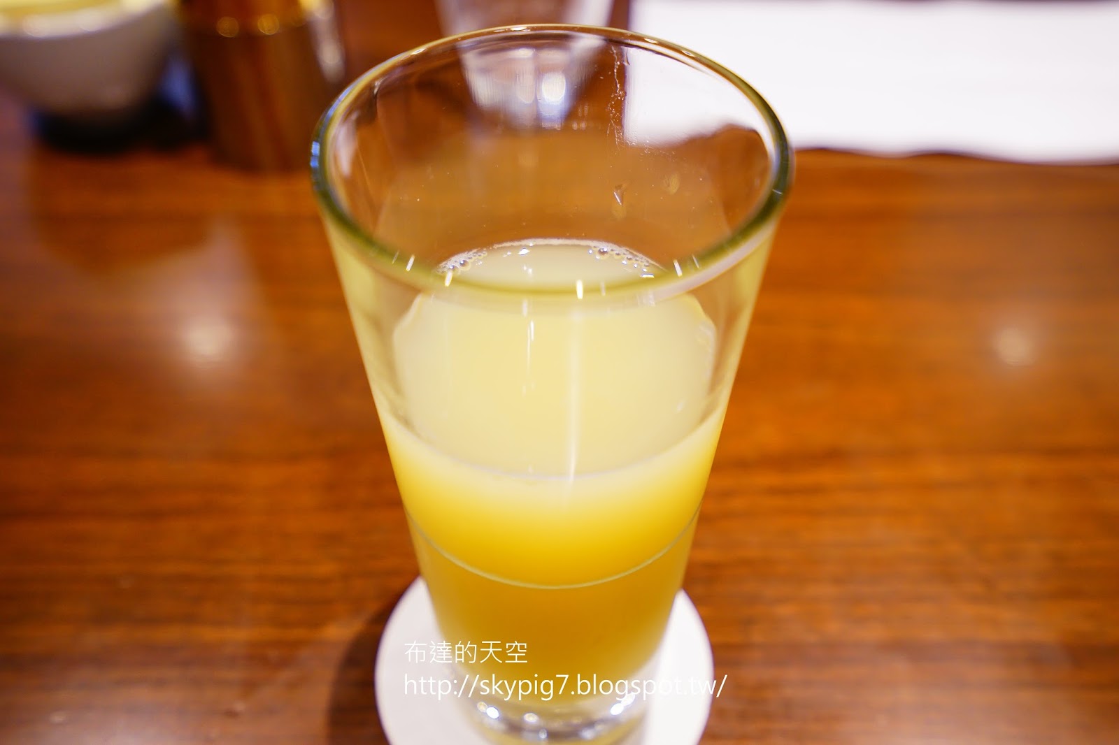 飲料點了柳橙汁,不加冰(氷り抜き),日本就是這樣,我說不加冰的話,他就只會來半杯,不會倒滿,這杯我還沒碰,剛端來就是這樣半杯了