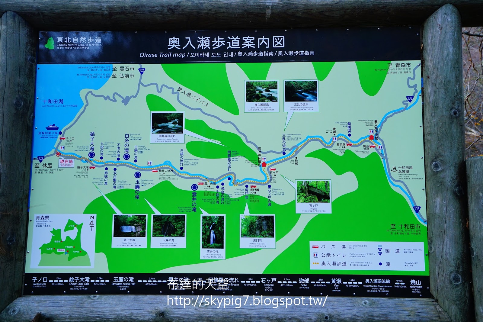 如何到奧入瀨溪可參考這篇,接著先用官網的奧入瀨溪流地圖來說明,所謂的在奧入瀨溪散策,主要是指「燒山」到「子ノ口」之間,全程走完約14公里,共需4、5個鐘頭左右,每個人視體力及時間而定,切記不要錯過最後一班巴士即可,另外要注意的重點有2個: