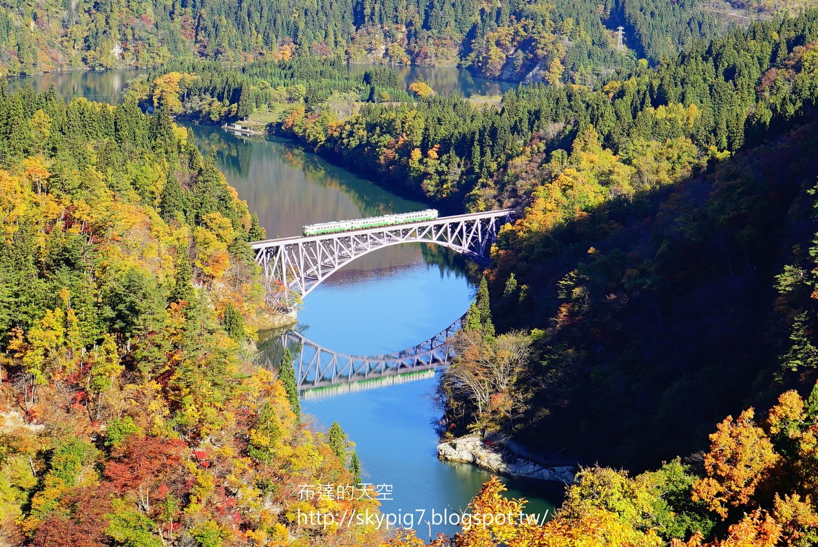 這應該就是最美的瞬間了,火車行駛於橋上,配上完全靜止的倒影,再以紅葉為背景,形成一幅美麗的圖畫