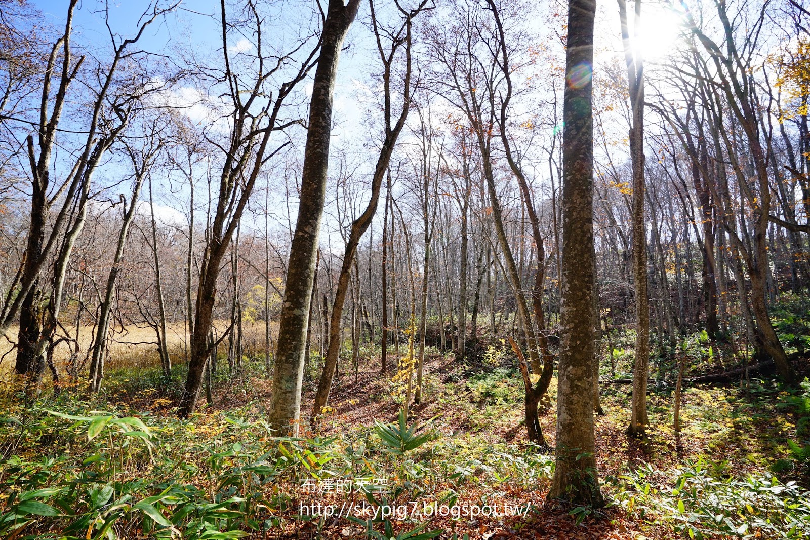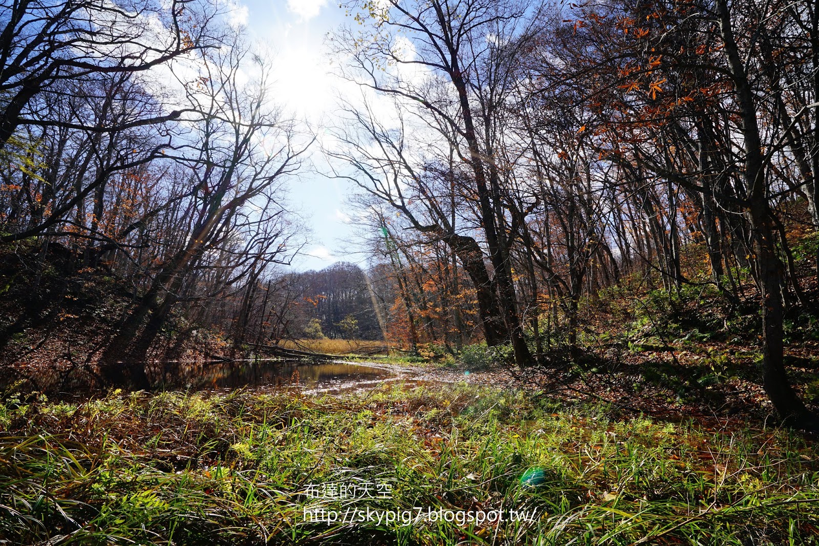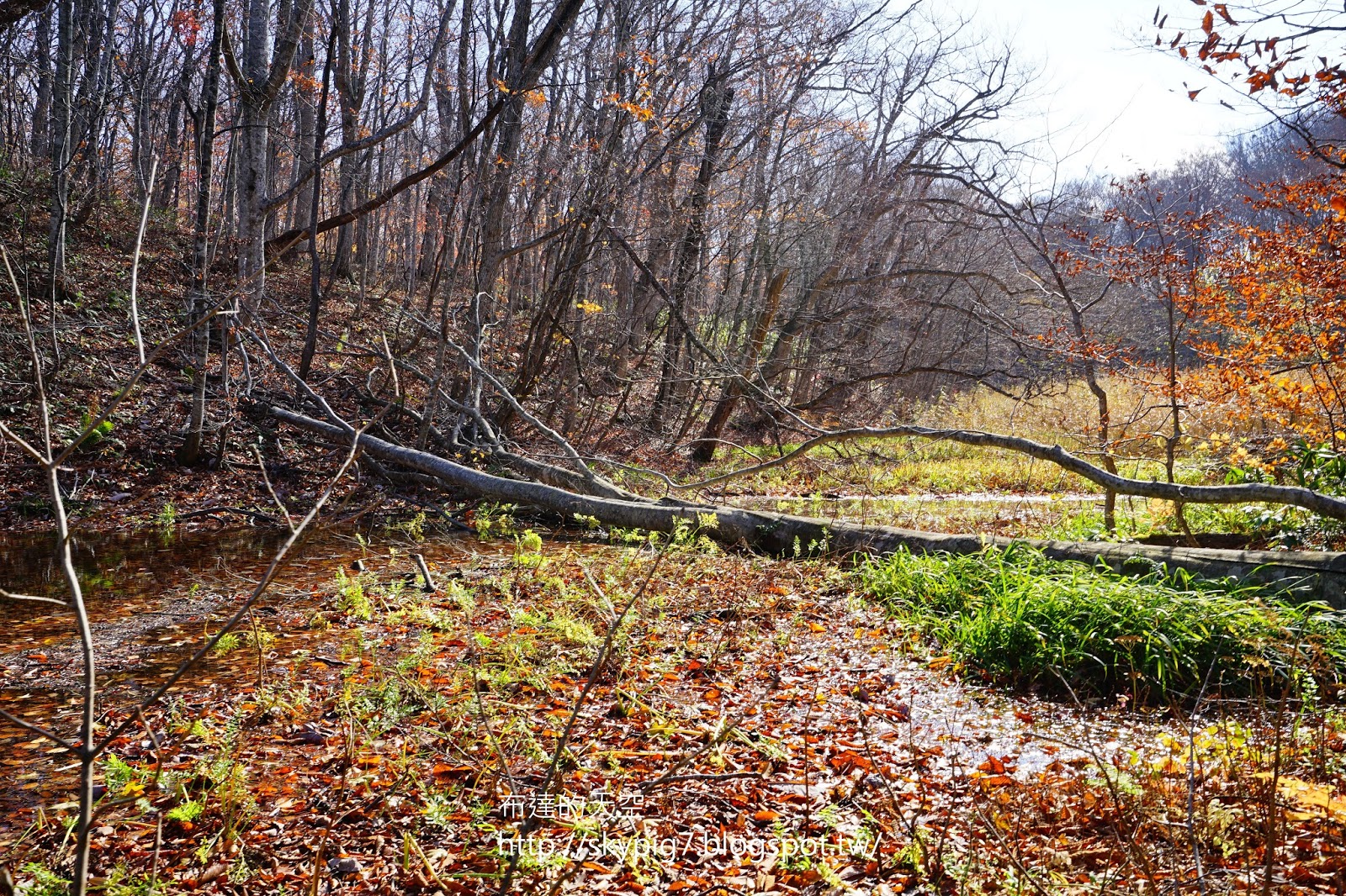 這時經過一條小溪,清澈的溪水反射出藍天與枯木