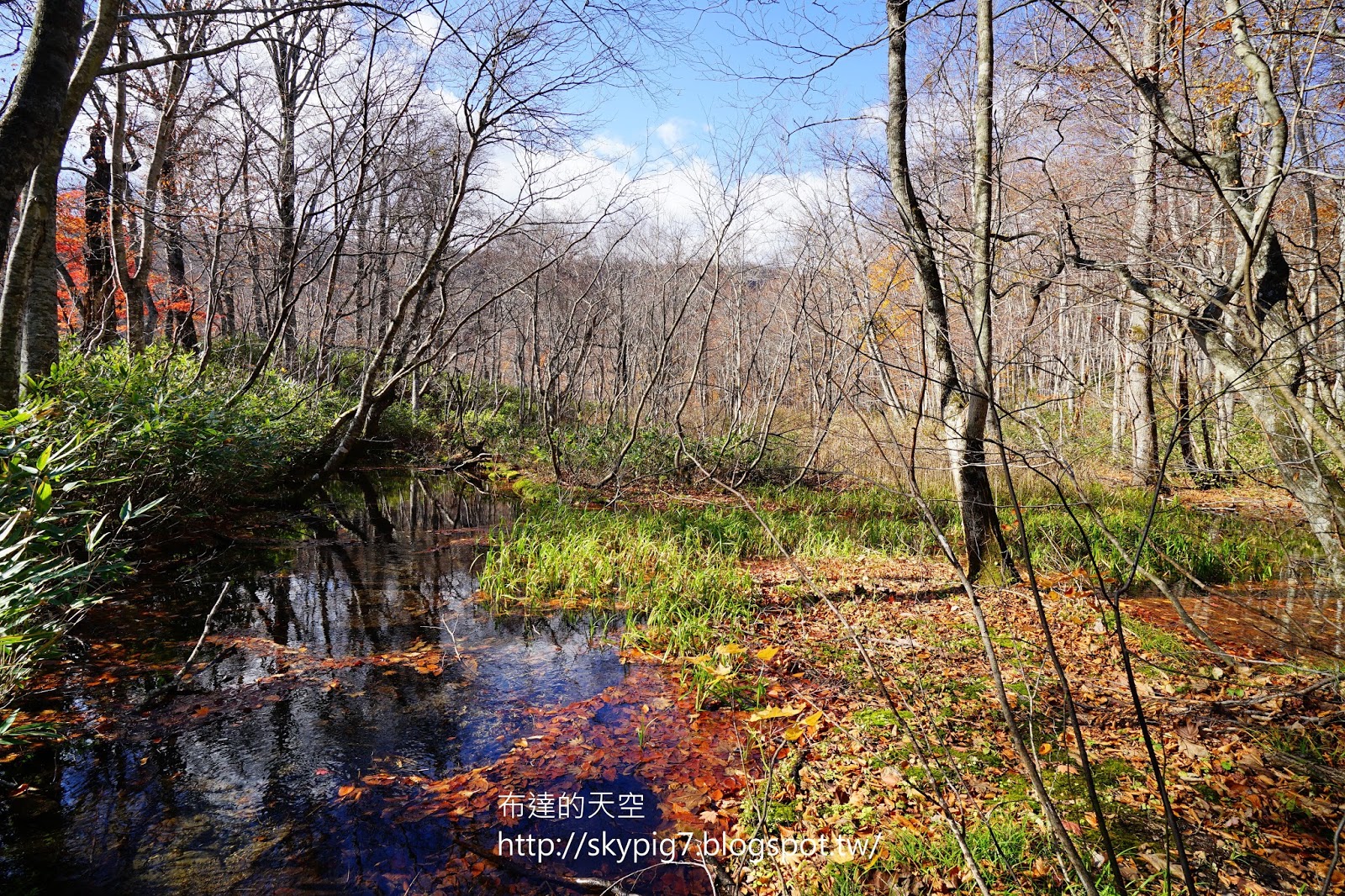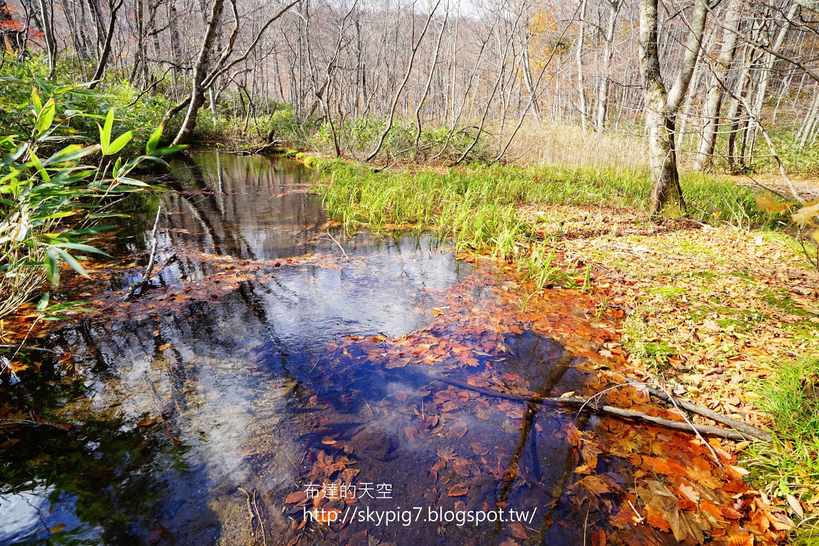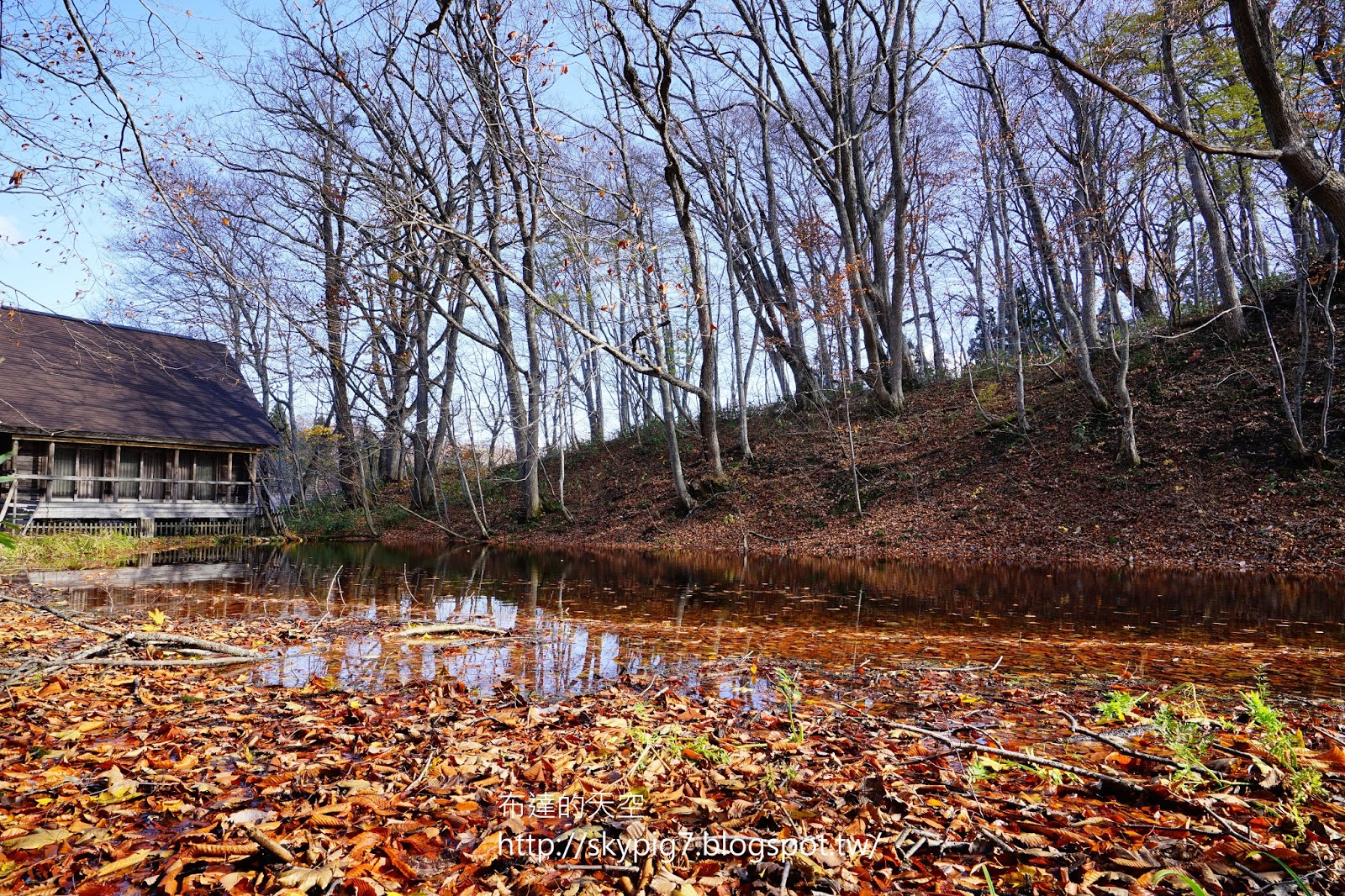 雖只見落葉於水裏,但看著枯木的倒影映入水面,加以藍天白雲點綴,心想這趟來對了