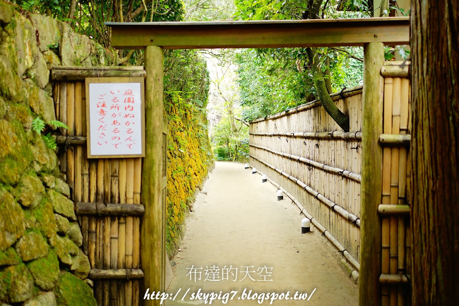 上階梯後,會經過一小段石板路,往左是參拝方向,可以走進詩仙の間,往右則會到庭院