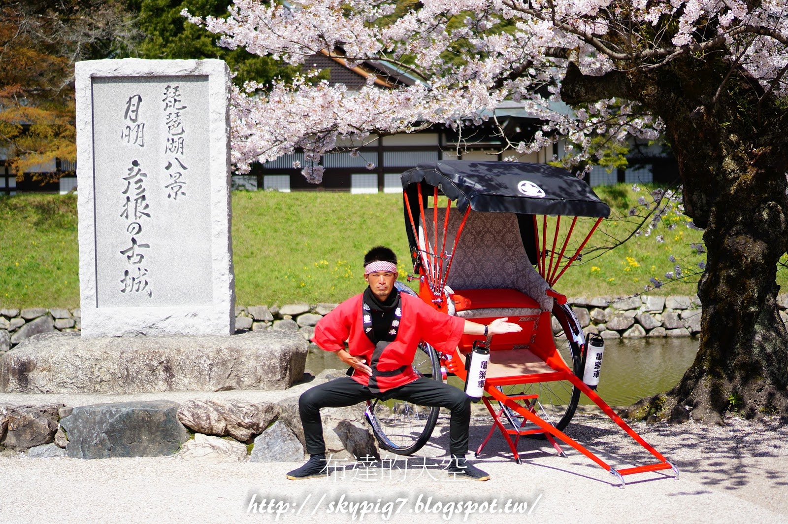 彥根城內的人力車,跟櫻花的美景形成逗趣的畫面