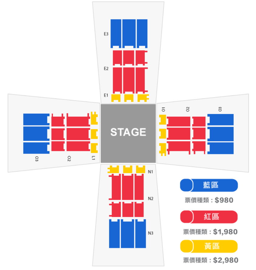 演唱會場內分成四區,分別為愛意(Love)、激情(Erotic)、詭異(Oddness)、夢魘(Night Horror)四個區域,加起來就是「LEON」。票價以黃區最接近舞台,所以最貴,然後向外遞減