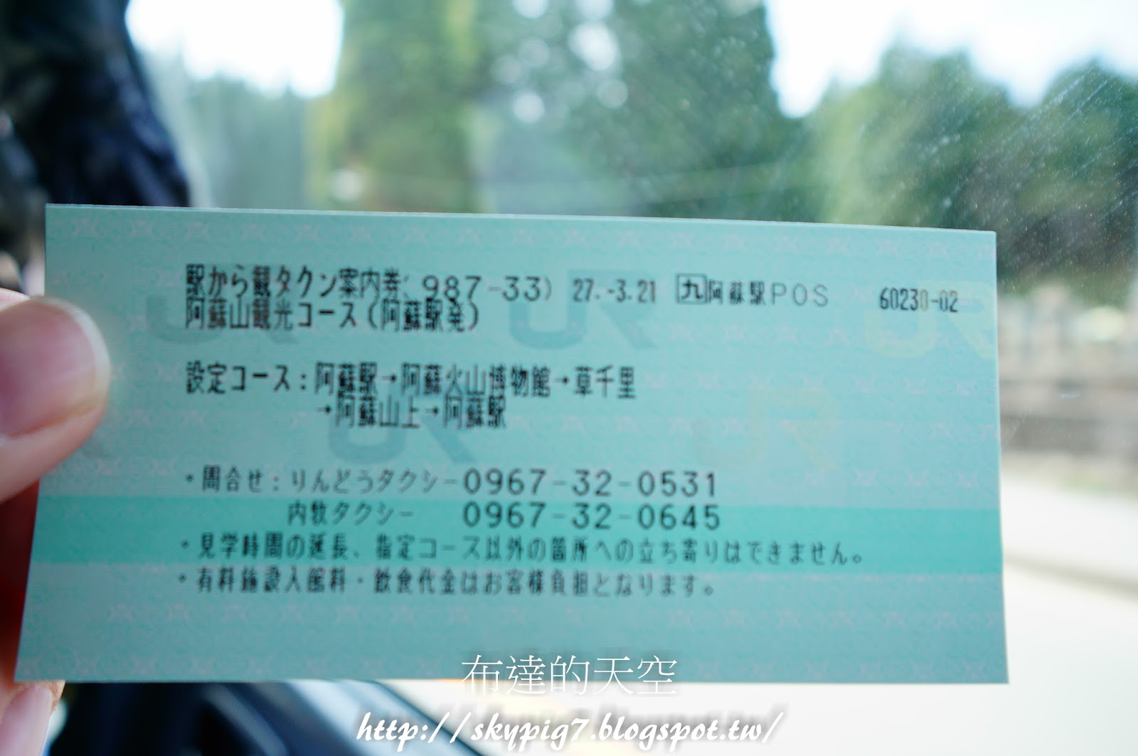 首先坐到阿蘇站後,問案內所有沒有計程車的方案,案內所指著旁邊JR的窗口說要在那買,所以就去JR的窗口買了這個行程,接著他說去門口的計程車站牌,拿票給計程司機就知道了,然後就開始今天阿蘇火山的旅程了。
