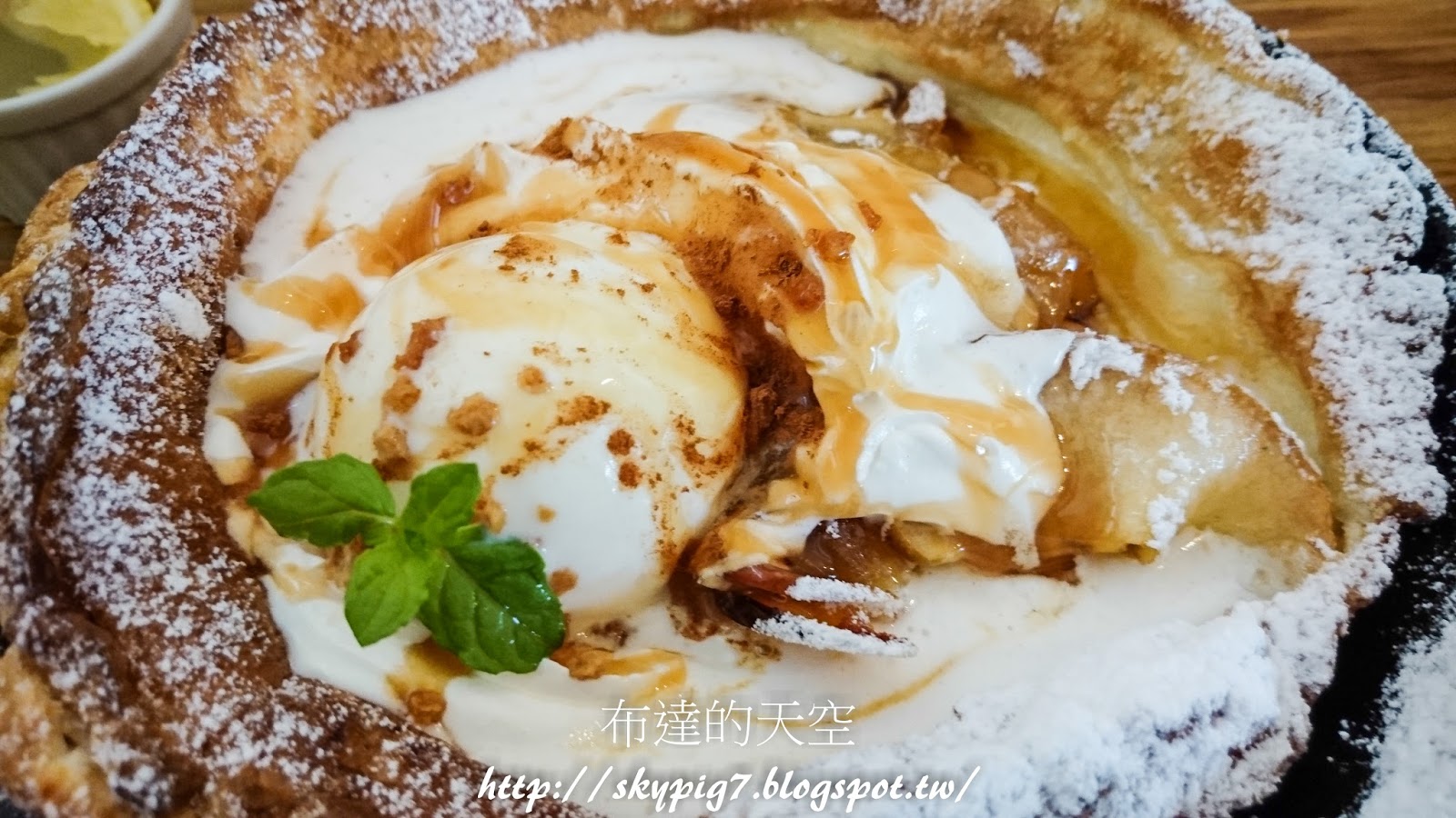 ▼除了在原本熱騰騰的鬆餅灑上糖粉外,還加上蘋果跟焦糖,中間再放一球冰淇淋