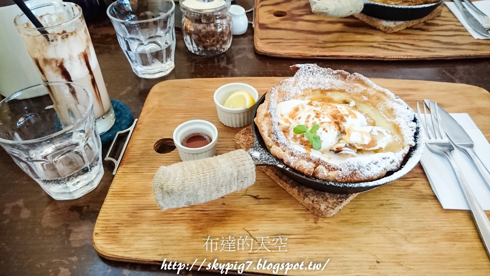 ▼DUTCH BABY PANCAKE剛起鍋時,馬上灑滿銀白色的糖粉,端上桌時熱騰騰鬆餅香味撲鼻而來