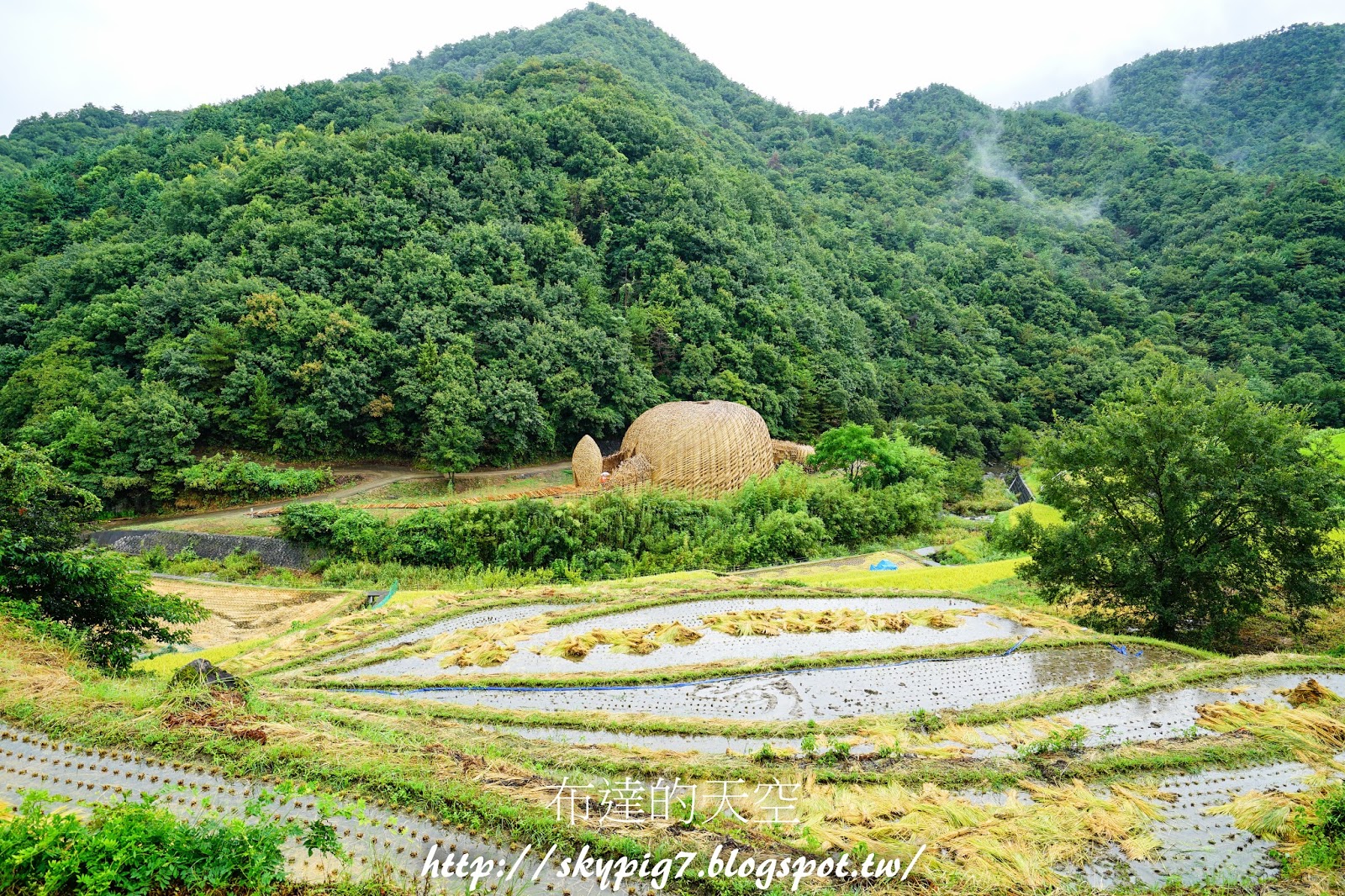 ▼作者想表達應該的是竹編建築與梯田、天空、森林融為一體的感覺吧