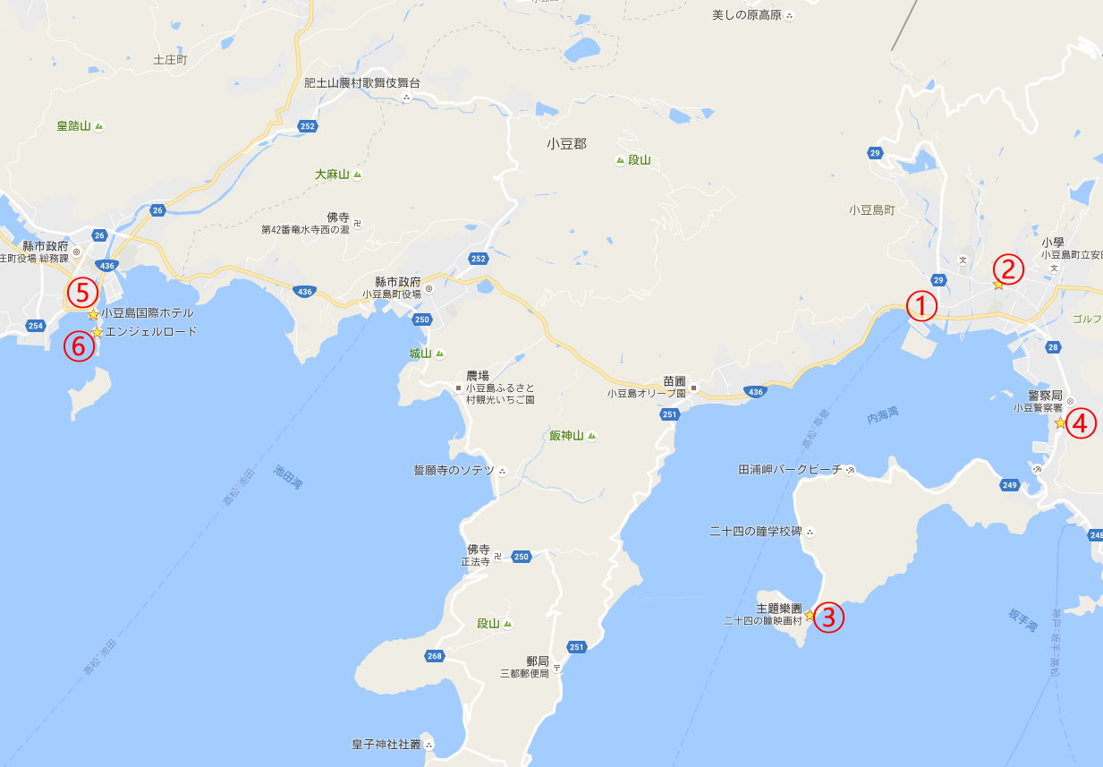 高松港(09:30)➔①小豆島草壁港(10:30)➔②シェフかわぐち(午餐)➔③二十四の瞳映画村➔④マルキン醤油記念館➔⑤小豆島国際ホテル check in➔⑥エンジェルロード(angel road)