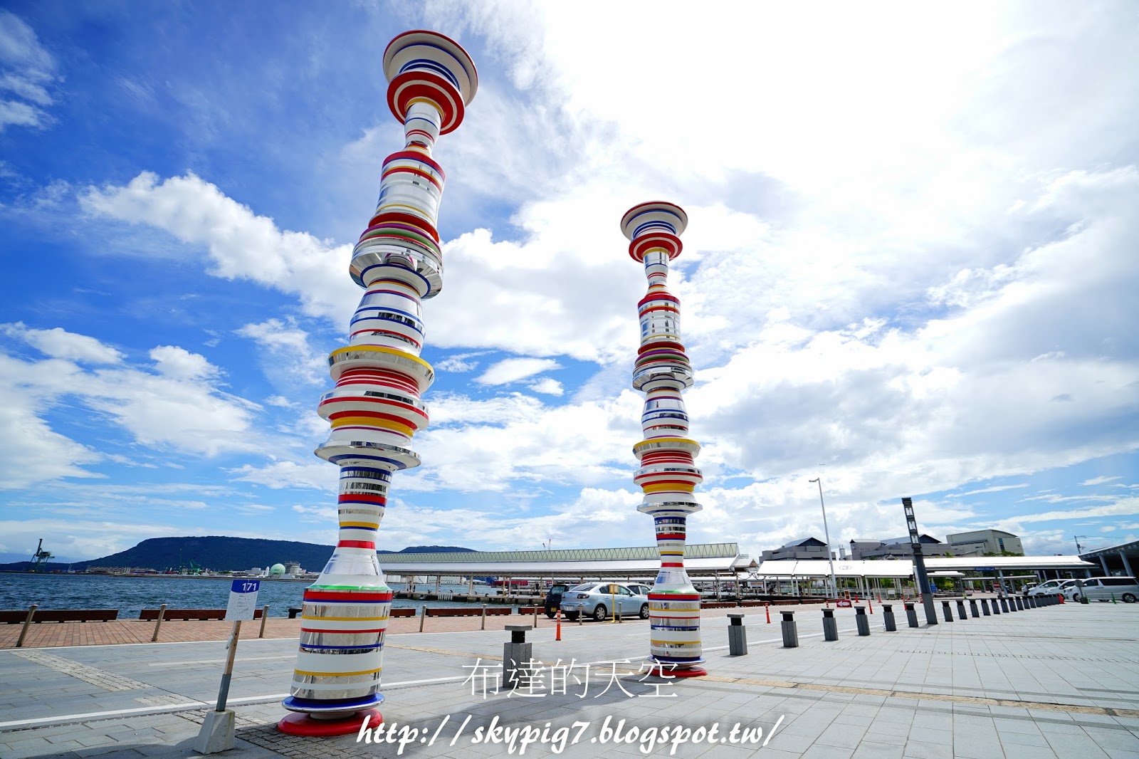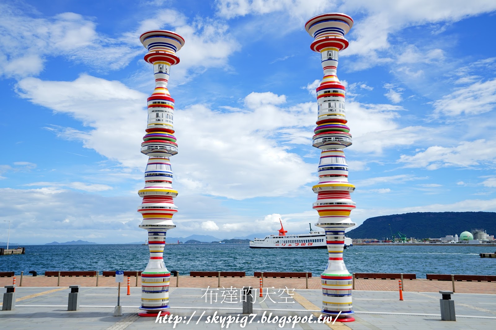 ▼走到高松港後,立馬看到這兩隻高8公尺佇立於天際的柱子