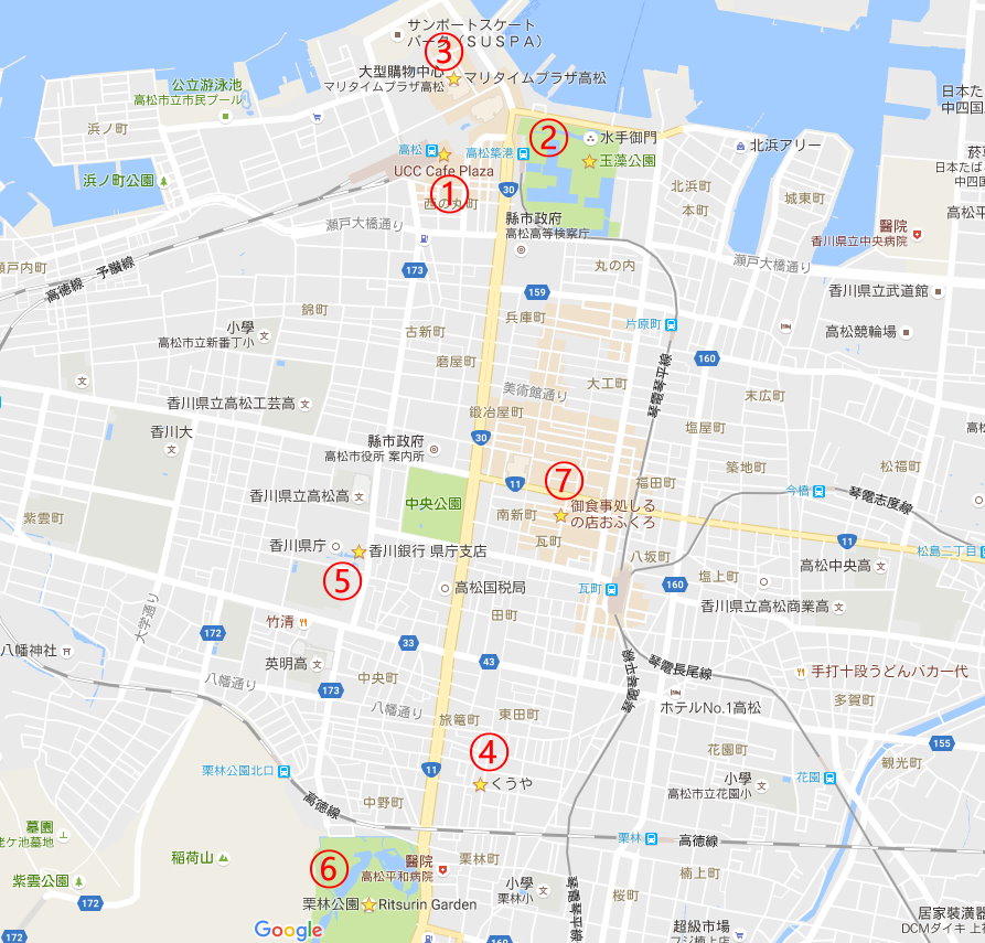①UCC Cafe Plaza(早餐)➔②玉藻公園門口➔③マリタイムプラザ(MARITIME PLAZA)高松展望台➔④くうや(午餐)➔⑤香川県庁舎➔⑥栗林公園➔⑦御食事処しるの店おふくろ(晚餐)