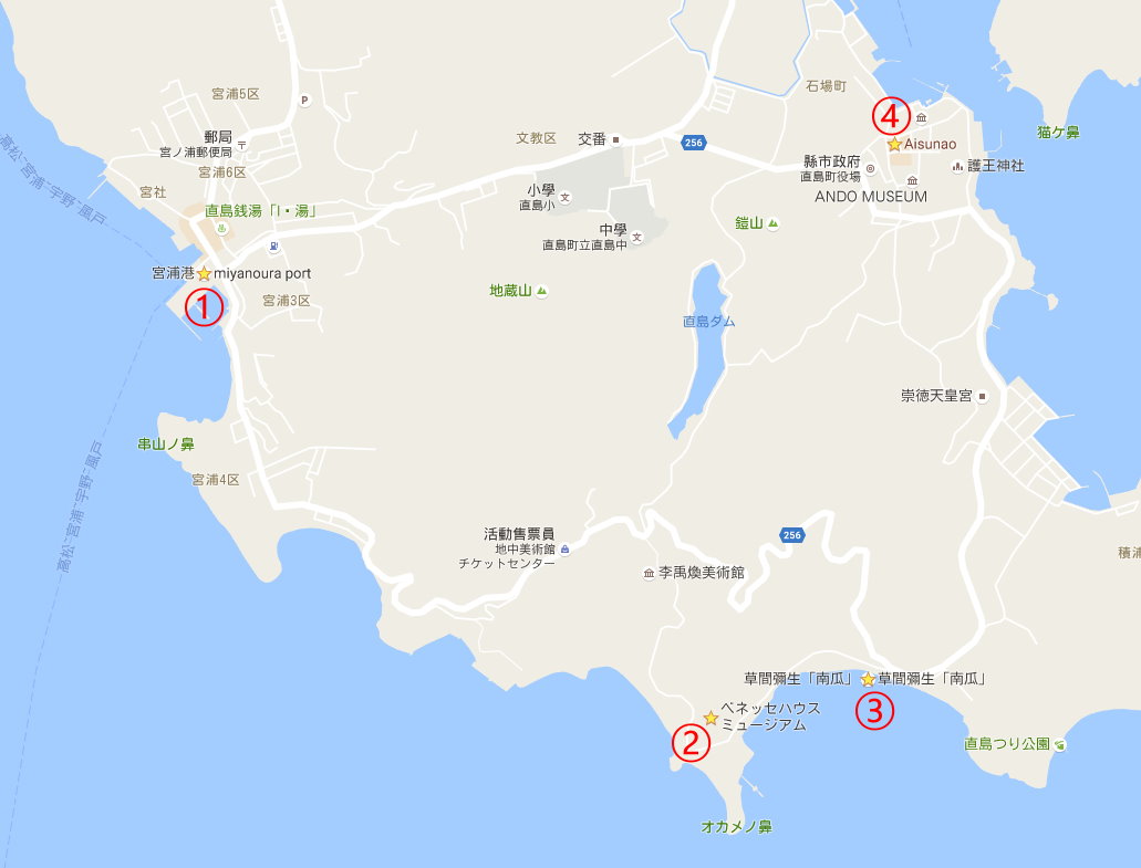 小豆島旭屋旅館➔①直島宮浦港➔②Benesse House➔③草間彌生南瓜➔④玄米心食 あいすなお➔小豆島旭屋旅館