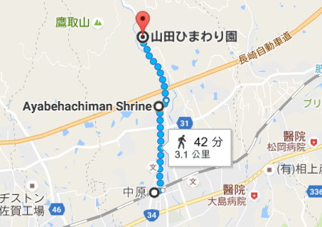 ▼坐JR到中原站下車後步行前往,中間會經過綾部八幡神社。如下圖所示,單趟約3.1公里,來回就6.2公里,查不到公車班次,所以決定步行前往