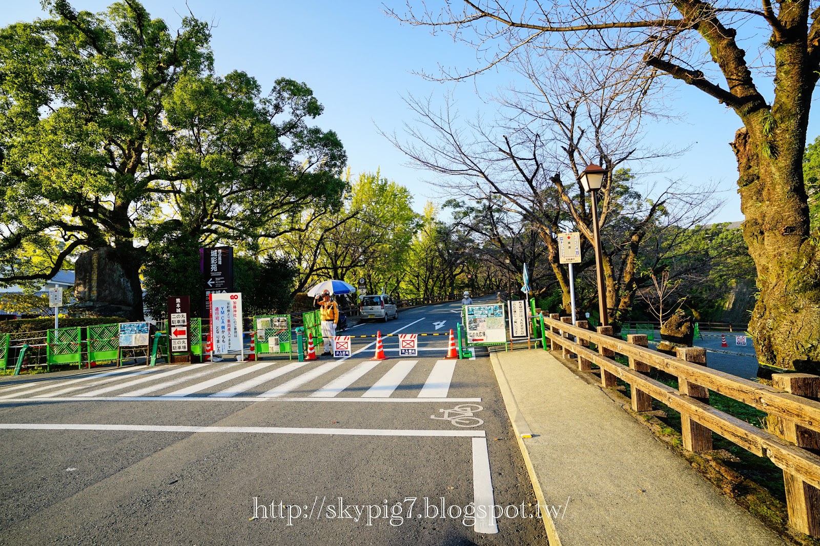 ▼用底下這張圖說明一下,這次一樣南側的行幸橋上來,原本直走就可以到熊本城的天守閣了,現在這條路已被封住,只能從城彩苑這個方向走,再到二之丸