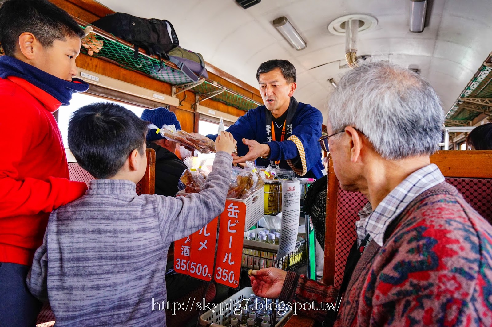 ▼早上這一班人不是很多,還有許多空位,過一會兒會有人穿著輕津鐵道的制服推車過來,可以跟他買魷魚跟酒
