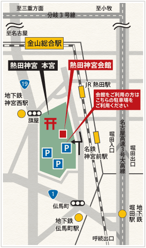 ▼坐JR的話在「熱田駅」下,名鐵的話在「神宮前駅」下,地鐵的話在「神宮西駅」下