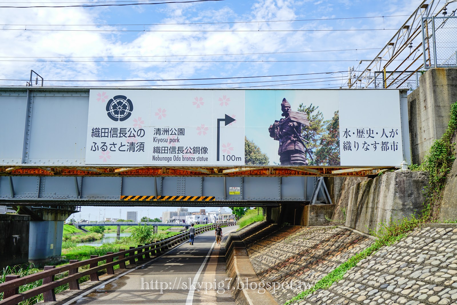 ▼逛完了清洲古城跡,看到河的另一邊就是清洲城,先不用急著過去,可以先去清洲公園看信長公銅像