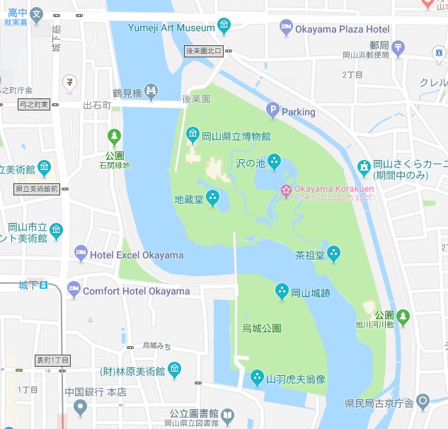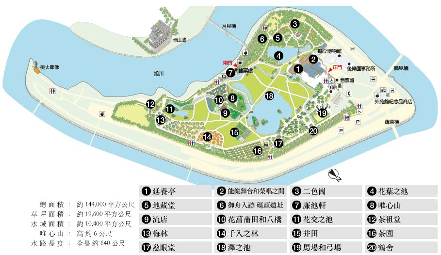 ▼在「岡山駅前」搭路面電車,往「東山」的方向,在「城下」下車後再走過來即可。可以直接走過鶴見橋後過來,會從後樂園正門進來,如果先去岡山城後,再過來的話則從南門(後門)進來