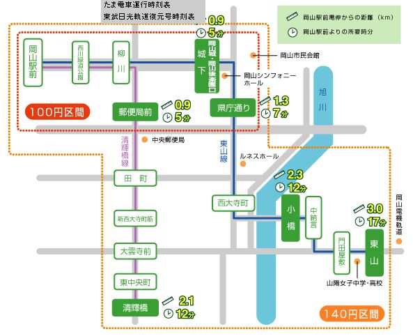 ▼岡山的電車主要分成二條路線,一條往東山,一條往清輝橋;二種價格區間,如下圖所示區間範圍分成100円及140円區間。另有販售一日券,大人400円。
