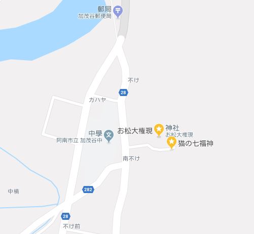 ▼當地的人們為了祭祀阿松,還有三阿喵,便建了「お松大権現」供奉